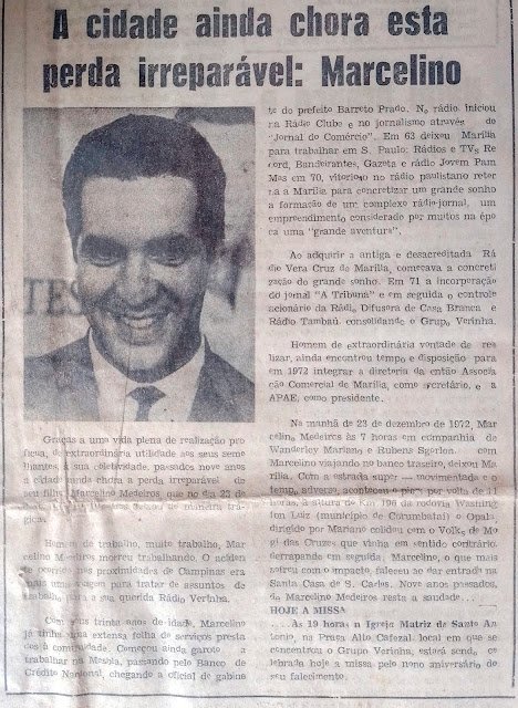 Era sábado, 23 dezembro, faltando dois dias para o Natal de 1972, quando um trágico acidente tirou a vida de Marcelino Medeiros, um jovem de 30 anos que se despontava como empresário no setor de comunicação no interior paulista. O acidente aconteceu por volta das 11 horas da manhã, na altura do km 186 da rodovia Washington Luís (SP-310), na época ainda com pista simples, na serra do município de Corumbataí, entre Rio Claro e São Carlos.