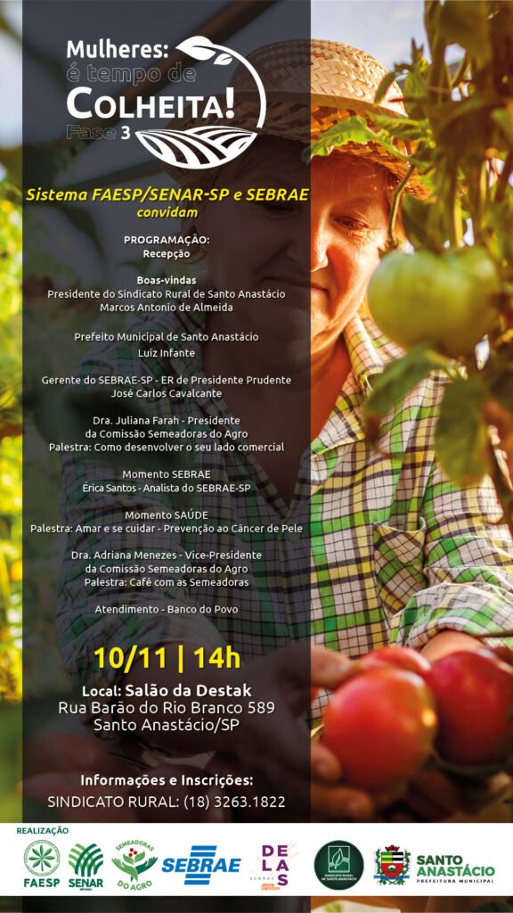 Em mais uma importante ação, o programa “Mulheres: É Tempo de Colheita!” chega nesta segunda-feira (10/11), à cidade de Santo Anastácio. A iniciativa é da Comissão Semeadoras do Agro, da Federação da Agricultura e Pecuária do Estado de São Paulo (Faesp), em parceria com o Sebrae DELAS, Sindicatos Rurais, prefeituras e entidades locais, e encerra o ciclo de capacitação e fomento a novas lideranças femininas no agro paulista.