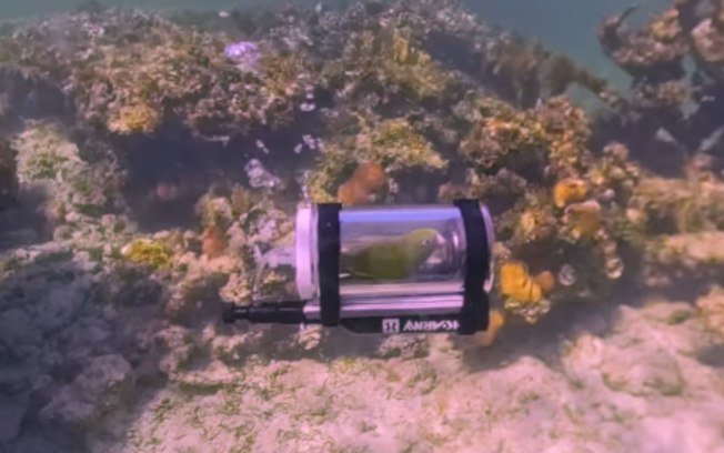 Nas imagens, é possível ver o momento em que o dispositivo é submerso, enquanto o papagaio observa o ambiente ao redor.