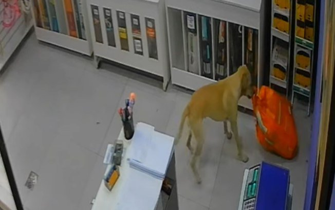 As câmeras registraram o momento em que o animal entra tranquilamente no estabelecimento e se aproxima de um pacote de ração. Com a boca, ela primeiro mexe no saco e depois o puxa e arrasta até a saída, deixando o local com o “prejuízo”.