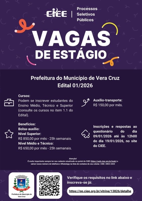 A Prefeitura do Município de Vera Cruz, em parceria com o Centro de Integração Empresa-Escola (CIEE), divulgou o Edital nº 01/2026 para o preenchimento de vagas de estágio no serviço público municipal. As oportunidades são destinadas a estudantes regularmente matriculados no Ensino Médio, Técnico e Superior, conforme cursos previstos no edital.
