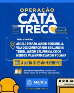 A Prefeitura de Marília, por meio da Secretaria Municipal do Meio Ambiente e Serviços Públicos, inicia na próxima segunda-feira (dia 23/02), uma nova etapa da Operação Cata-Treco, com atendimento nos bairros Argolo Ferrão, Fontanelli, Vila dos Comerciários I e II, Teruel, Califórnia, Chico Mendes, Vila Maria e Polyana – todos localizados na zona Oeste da cidade.